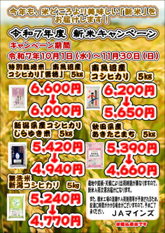 令和7年11月30日(日)まで、各金融店舗やマインズショップ各店にて、新米キャンペーンを実施中です!