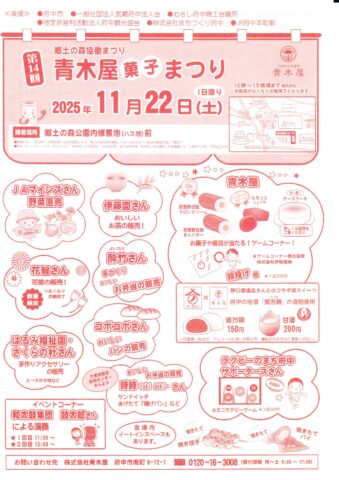 当日は、青木屋の限定商品が販売されるほか、和太鼓の演奏やミニゲームなども開催されます。皆様のご来場を心よりお待ちしております!