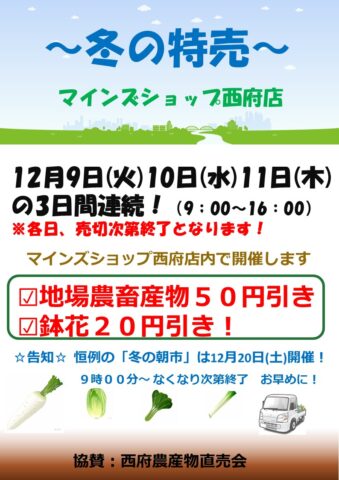 12月9日(火)・10日(水)・11日(木)の3日間、マインズショップ西府店では冬の特売を行います!地場農畜産物が50円引き、鉢花は20円引きで販売しますので、皆様のご来店をお待ちしております。